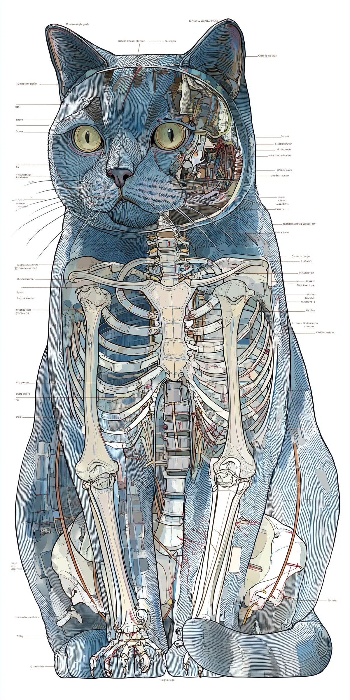 This anatomical diagram not only serves as a conversation starter but also adds a touch of sophistication to your decor. Perfect for those who appreciate the beauty of animals and the art of illustration, this piece will inspire admiration and curiosity in anyone who sees it. Embrace the aesthetic of science and nature with this stunning portrayal of a British Shorthair cat.