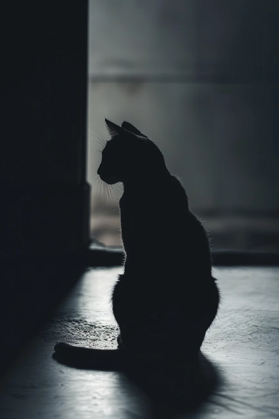 This striking image features a black cat gracefully sitting in the shadows, illuminated by a soft light that highlights its elegant silhouette. The deep contrasts and minimalist aesthetic create a moody atmosphere that draws you in, making it a perfect addition to any art collection. The cinematic lighting adds a touch of drama, making the cat appear almost like a mysterious figure in a beautifully crafted illustration.