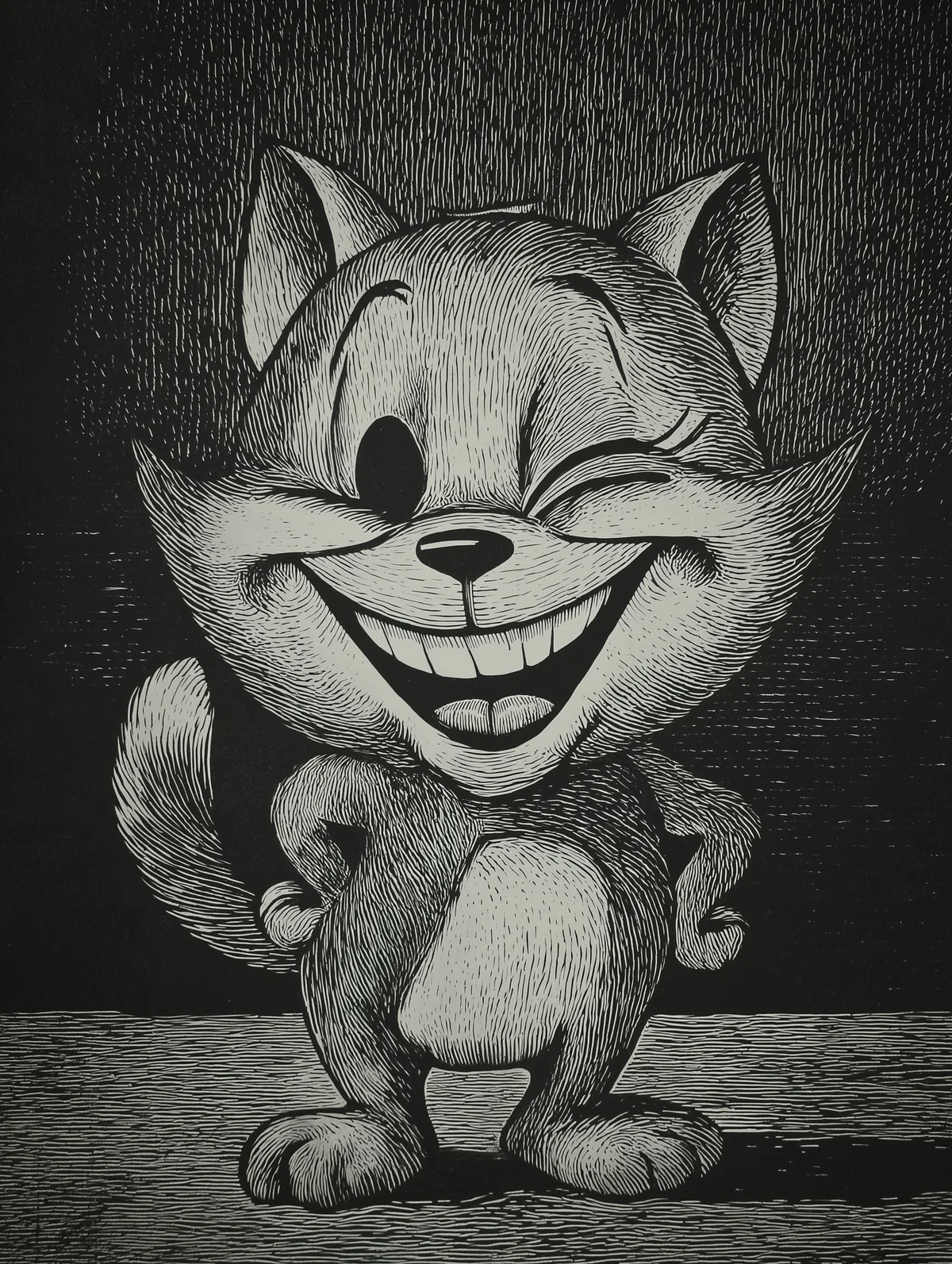 This delightful engraving captures the essence of a playful 1950s cartoon cat, featuring a big smile and a cheeky wink that instantly brings a sense of joy. The vintage illustration showcases the charming style of mid-century animation, making it a perfect piece for any cat lover. The cat’s expressive face and whimsical pose add a lighthearted touch to your decor.