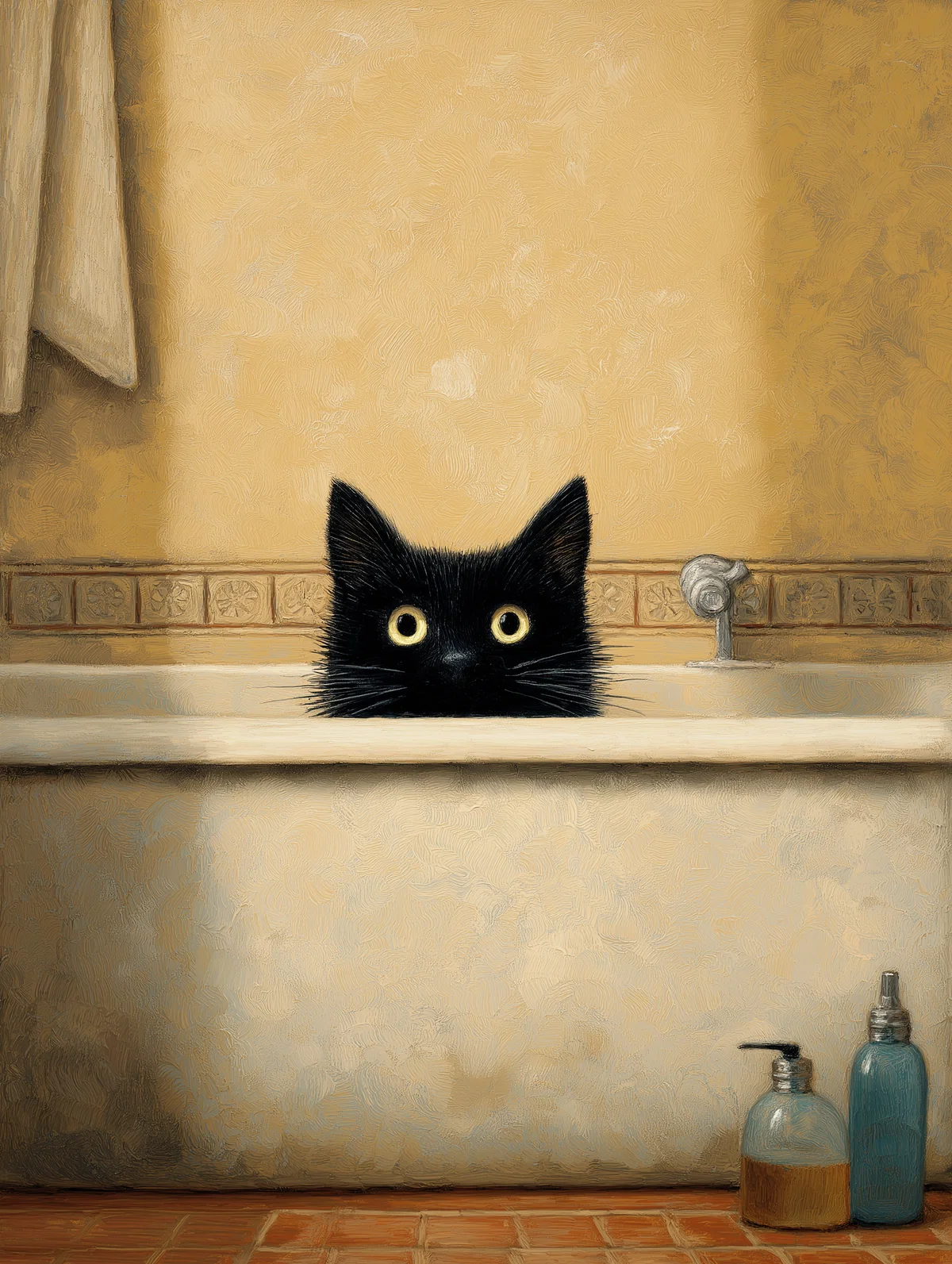 This image would make a lovely addition to your wall art collection, adding character and warmth to your home. Whether you’re decorating a cat-themed nook or simply looking to infuse your space with a bit of charm, this artwork is sure to spark joy. The playful mood of the black cat evokes a sense of comfort, making it ideal for a cozy bathroom or a whimsical corner in your living room.