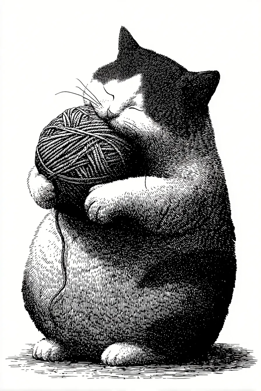 This delightful illustration captures a charming cat embracing a ball of yarn as if it were a precious treasure. The simple ink style and hard contrast create a striking visual that draws the eye, while the bright white background emphasizes the cat’s playful spirit. This artwork perfectly encapsulates the cozy, whimsical vibe that cat lovers adore.
