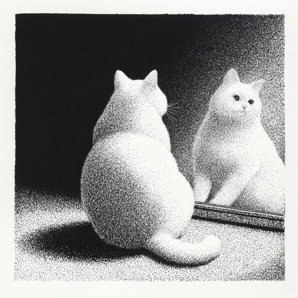 This charming stippling illustration captures the whimsical moment of a chonky white cat admiring itself in the mirror. The detailed texture and shading bring the scene to life, showcasing the cat’s fluffy form and curious expression. The back view adds an element of intrigue, inviting viewers to imagine what the cat sees in its reflection.