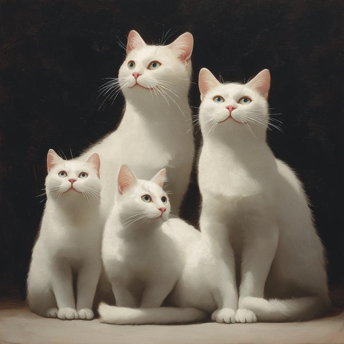 This delightful image features four charming white cats, each exuding their own unique personality. Their soft fur and playful expressions add a touch of warmth and joy to any space. The serene color palette creates a calming atmosphere, making it perfect for those who appreciate a cozy home aesthetic.