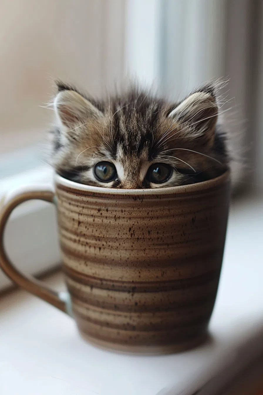 Cute kitten peeking over a coffee mug captures the essence of cozy cafe vibes. This adorable image showcases a tiny furball almost hidden behind a mug that’s nearly as big as its head, set against a warm-toned backdrop that enhances the inviting atmosphere. Perfect for cat lovers and coffee enthusiasts alike, this aesthetic photography piece brings a touch of whimsy to your Pinterest feed. Discover more cute animal photos and cozy cafe inspirations to brighten your day and create a warm, inviting space at home.