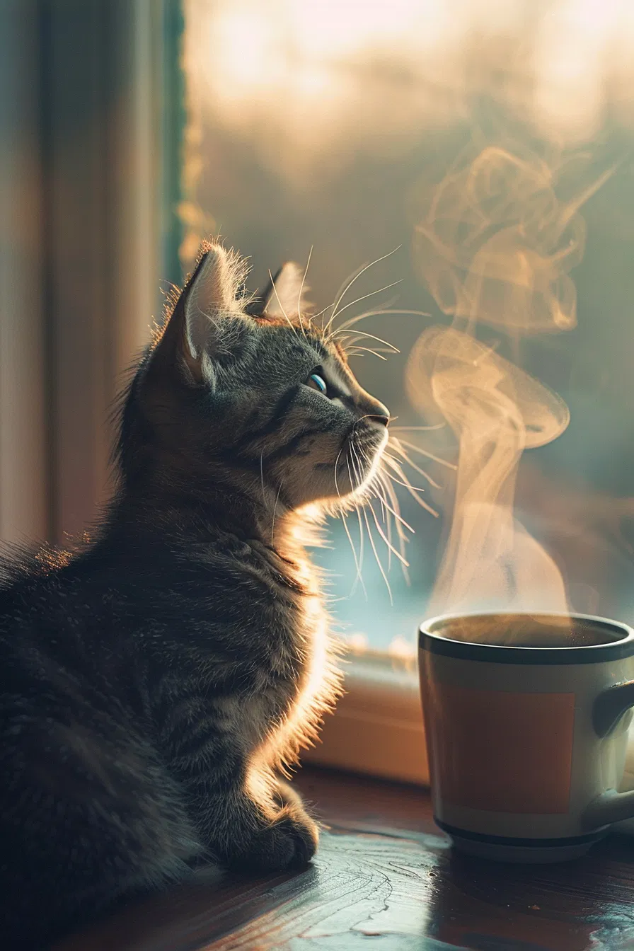 Fluffy cat sniffing coffee captures the essence of a cozy morning kitchen. This Pinterest aesthetic photo showcases a rustic wooden table bathed in warm sunlight, creating a perfect atmosphere for cat lovers and coffee enthusiasts alike. Imagine the serenity of waking up to this delightful scene, where your furry friend shares in the simple pleasures of life. Ideal for inspiration on home decor, morning routines, and pet-friendly spaces, this image invites you to embrace warmth and comfort in your daily rituals.