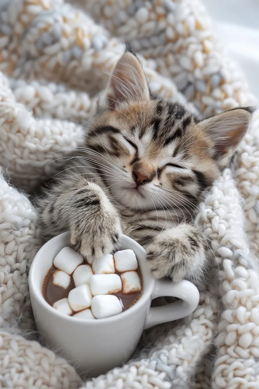 Cozy winter vibes with a sleepy kitten wrapped in a soft blanket beside a steaming mug of hot chocolate topped with fluffy marshmallows. This charming scene captures the essence of a perfect winter day, inviting you to snuggle up and enjoy the warmth. Ideal for anyone searching for cozy home inspiration or cute pet moments, this aesthetic image is perfect for your winter mood board. Discover the joy of simple pleasures and let this delightful moment inspire your own cozy corners at home.