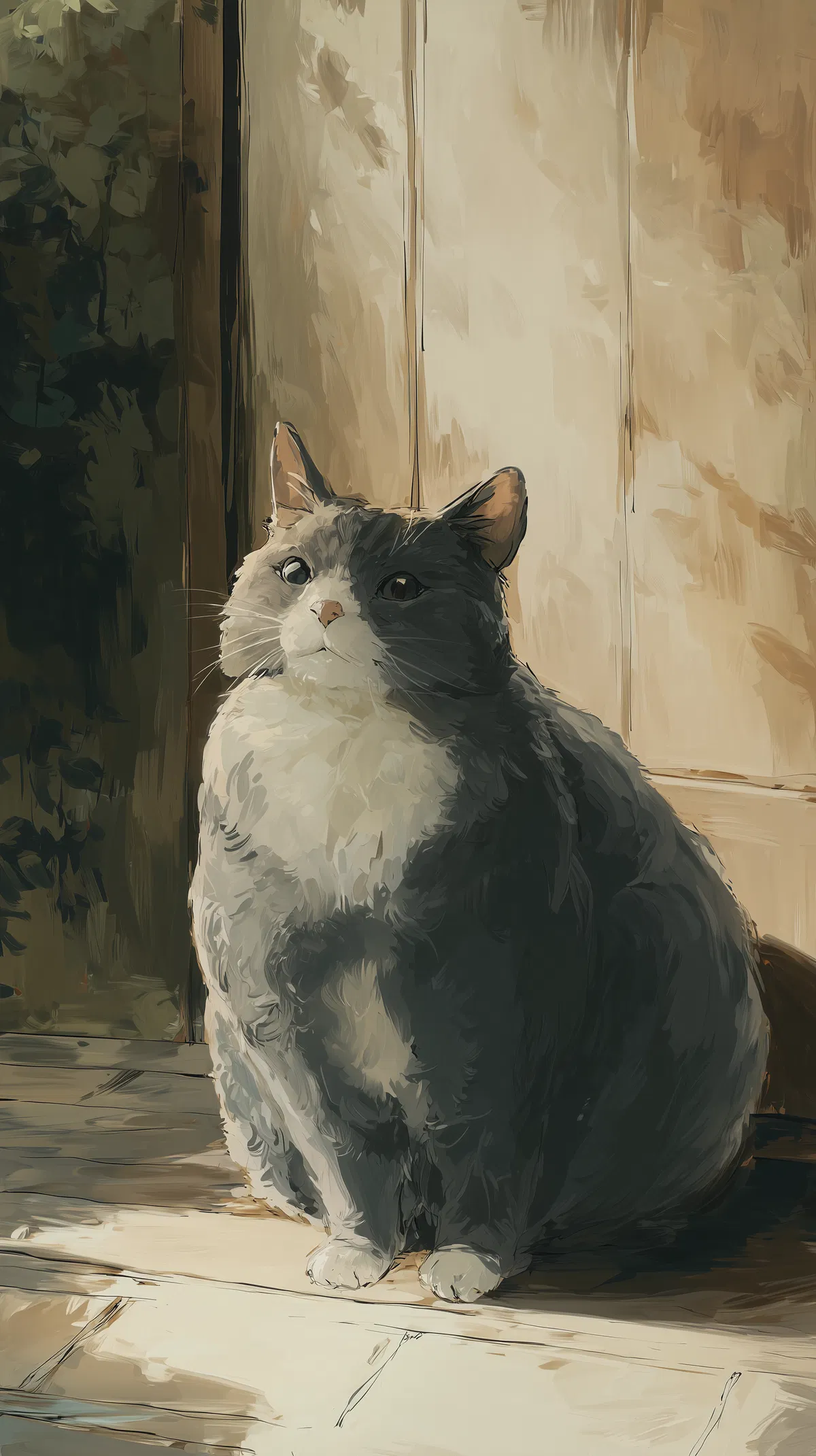 This adorable illustration features a plump gray cat in the charming Ghibli style, perfect for animal lovers and fans of whimsical decor. With its soft gray fur, white mouth, neck, chest, and paws, this cute feline radiates warmth and playfulness. The cat’s big, expressive eyes gaze directly at the viewer, inviting you into its cozy world.