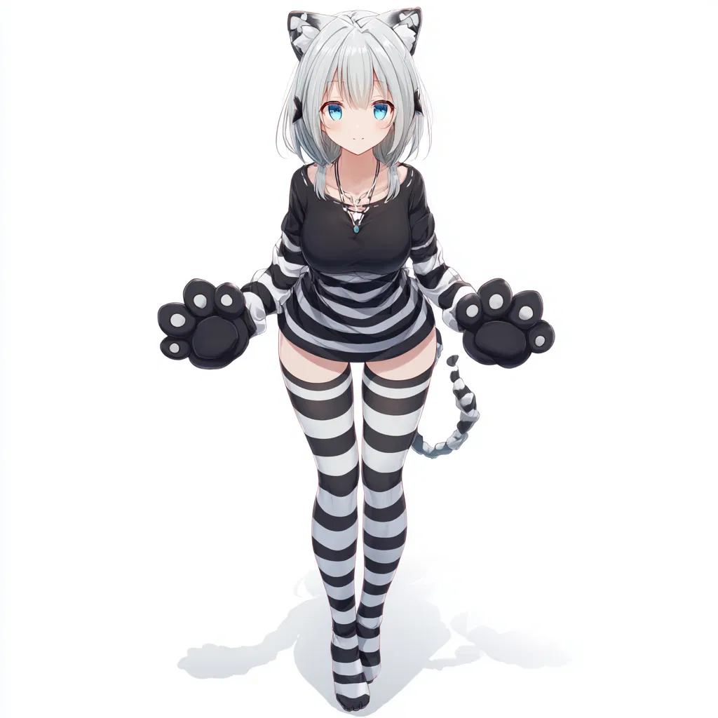 This adorable anime character captures the whimsical charm of a cute neko girl, complete with playful black and white striped tights that add a fun twist to her look. Her silver hair flows beautifully, contrasting with her striking blue eyes, making her an enchanting figure that draws you in. The full-body shot showcases her delightful paws and tail, embodying the perfect blend of feline grace and anime flair.