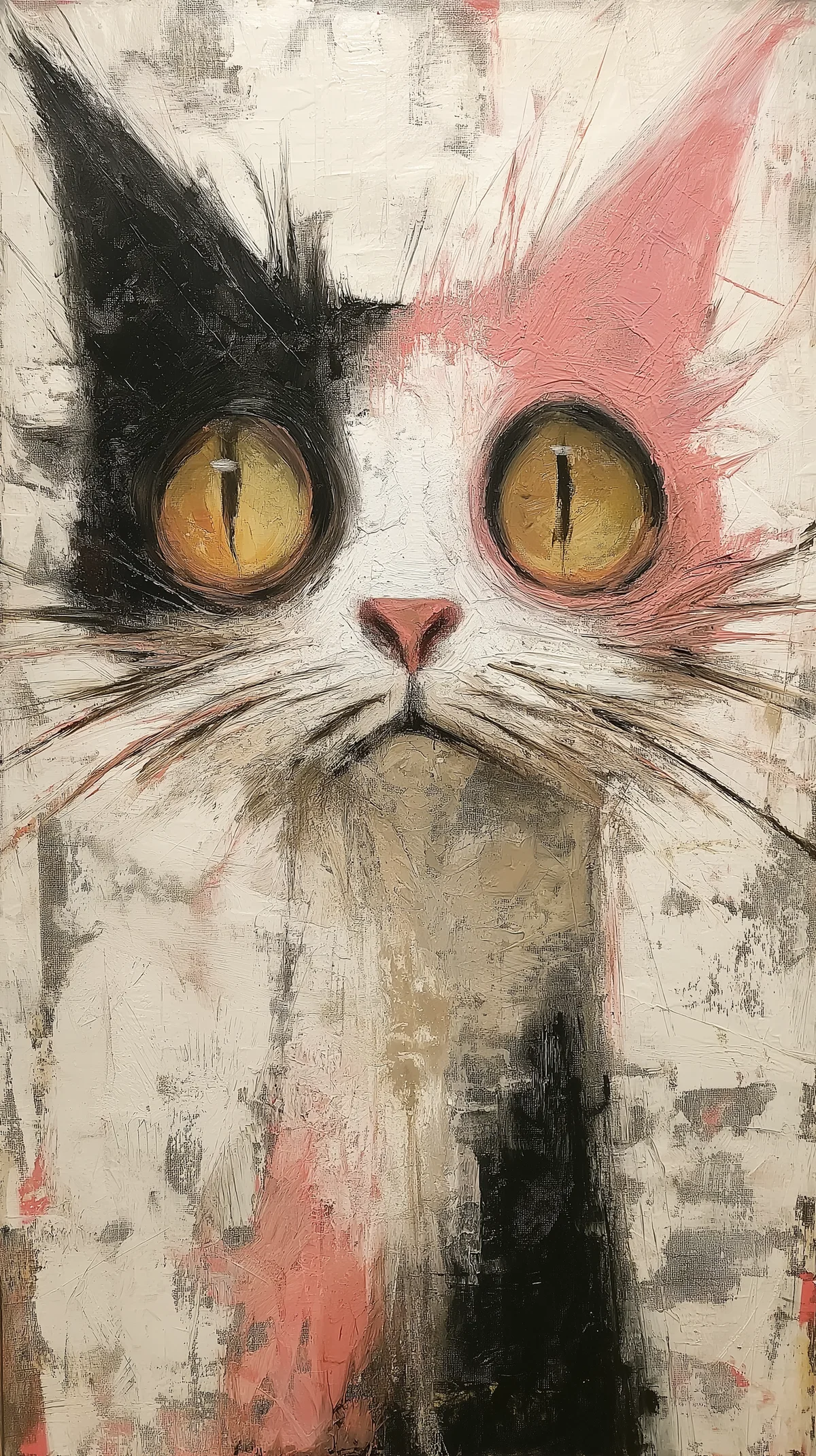 Imagine this eye-catching cat art in your cozy reading nook or as a focal point in your living room. It’s an excellent choice for those looking to elevate their home decor with something that’s not just beautiful but also tells a story. This painting is sure to resonate with anyone who appreciates a more avant-garde aesthetic in their home.