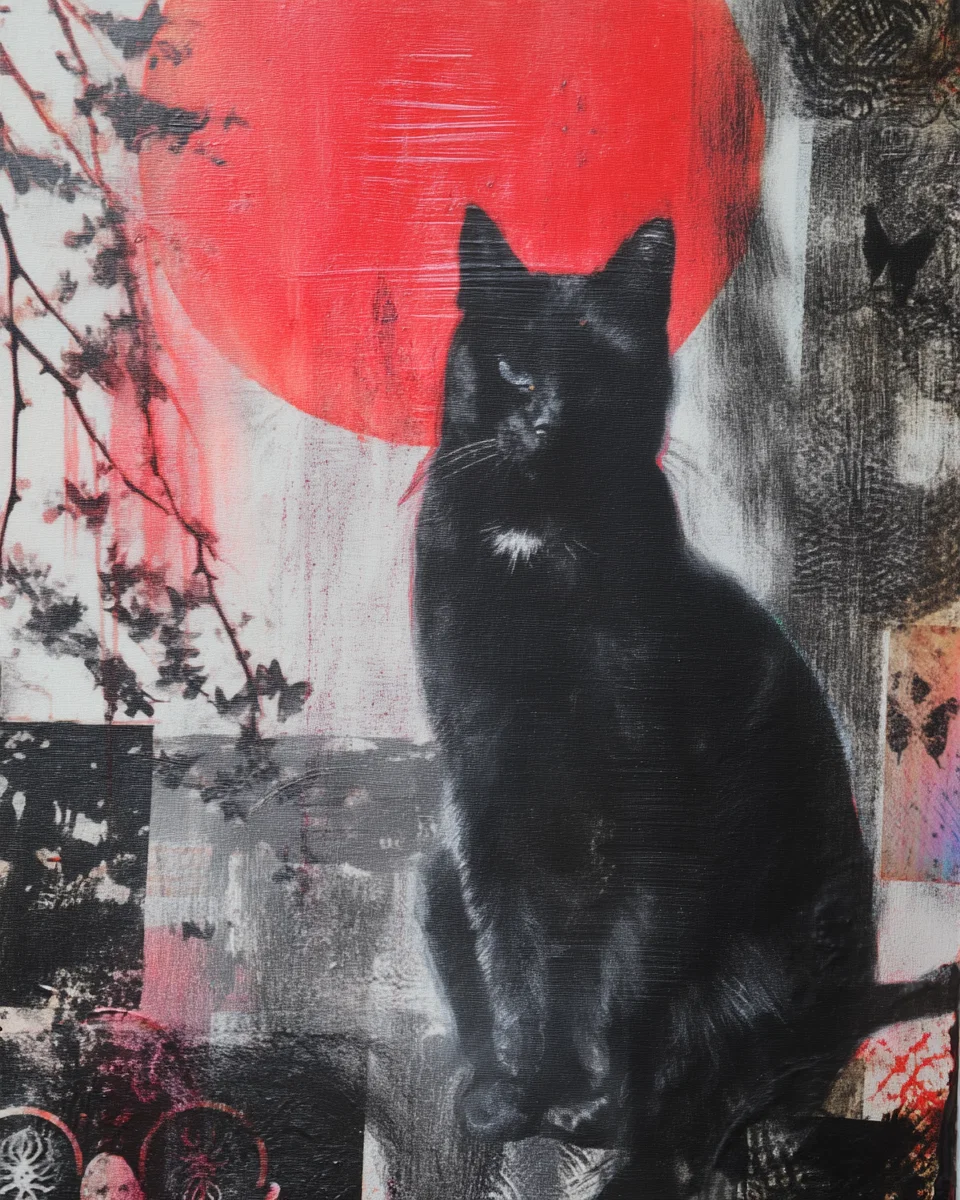 This captivating wall art piece features an eerie black and white cat illustration that draws you in with its mysterious vibe. The stark monochrome palette is beautifully contrasted by a surprising pop of color, giving the artwork an intriguing edge. The use of cross-hatching and palette knife techniques adds depth and texture, creating a striking visual that stands out in any setting.