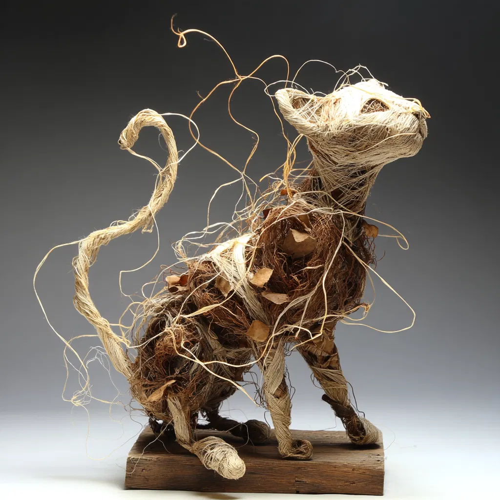 Discover the charm of this elegant cat sculpture that beautifully blends twine and silk elements for a unique decor piece. This delightful illustration captures the essence of feline grace, making it a perfect addition to any cat lover’s home. The soft textures of the silk combined with the rustic appeal of twine create a warm and inviting atmosphere, ideal for cozy spaces.