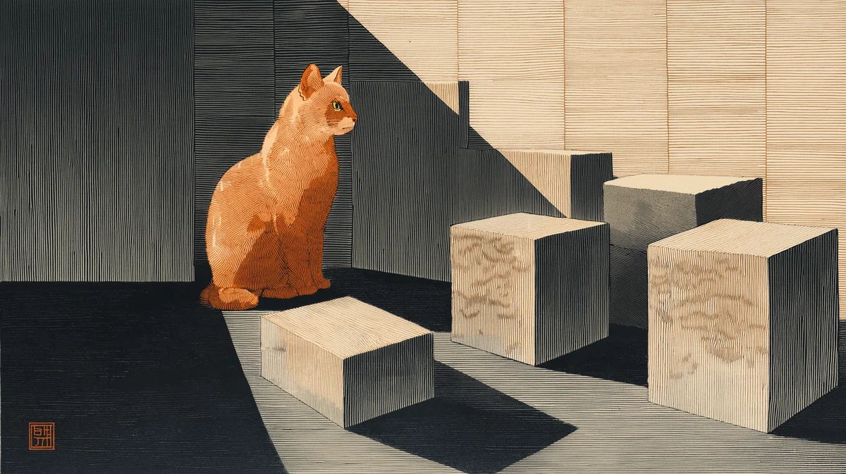 This charming illustration features a graceful orange cat, captured in a stunning wood-block print style inspired by the artistry of Ohara Koson. The high contrast between the cat’s vibrant fur and the dark, rectangular blocks creates a striking visual effect that draws the eye. The play of light and shade adds depth, making this piece not just an illustration, but a statement of elegance.