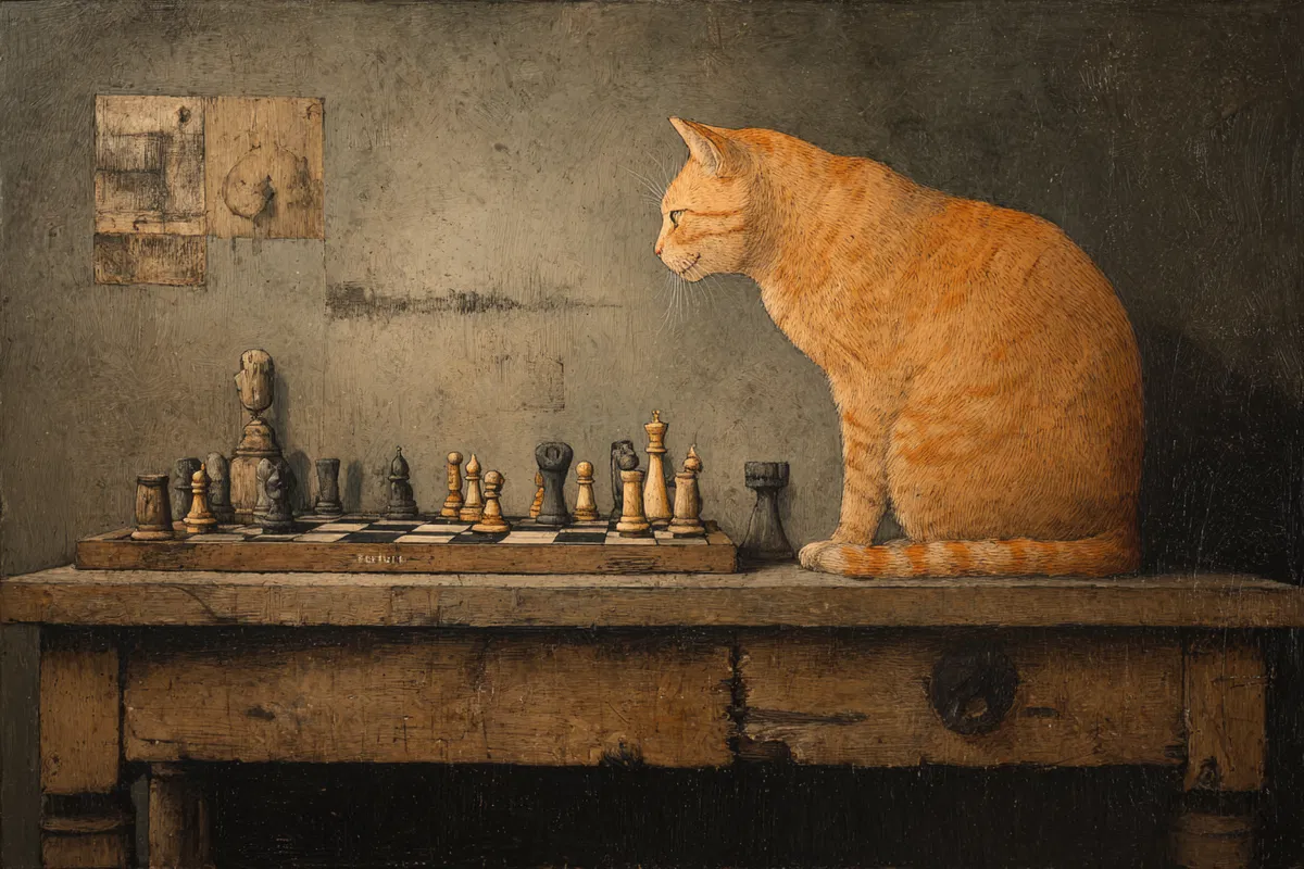 Imagine this playful illustration gracing your living room or study, adding a touch of whimsy and personality to your walls. It’s a lovely conversation starter that captures the essence of feline curiosity and intelligence. The unique depiction of the cat in a thoughtful pose invites viewers to appreciate the art of play and strategy, making it a perfect fit for cat lovers and chess enthusiasts alike.