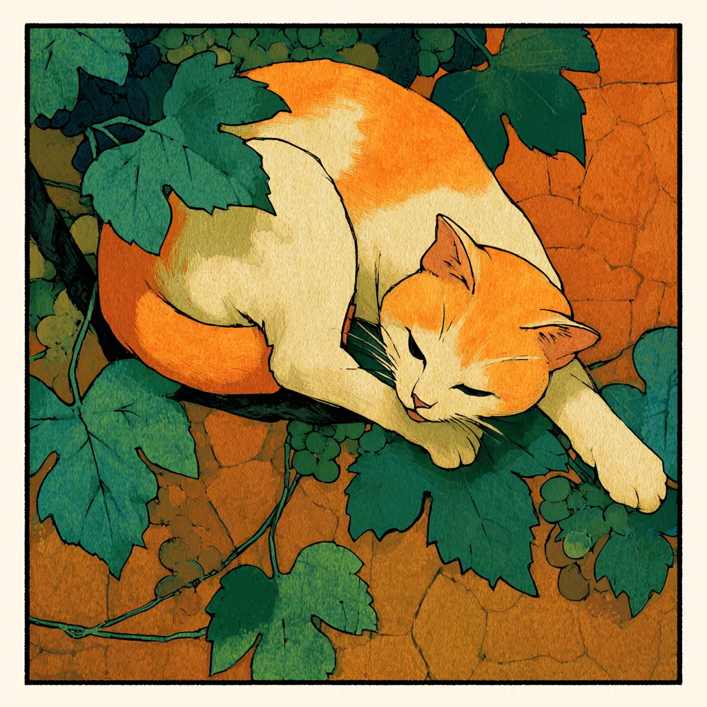Imagine a serene scene featuring a minimalist cat, elegantly sprawled beneath a gentle vine. This artwork, inspired by the vibrant style of Franz Marc, captures the essence of simplicity and tranquility. The clean lines and soft colors create a calming atmosphere, making it a perfect addition to any modern home.