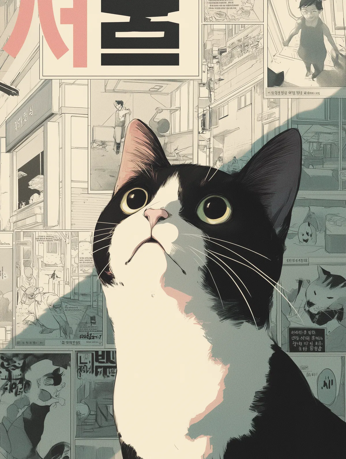This charming cartoon cat illustration captures the essence of Korean manhwa with its clean lines and expressive features. The character is depicted in a playful pose, radiating a sense of joy and whimsy that cat lovers will adore. Set against a stylish modern background that incorporates elements of Korean culture, this artwork beautifully blends traditional aesthetics with contemporary design.