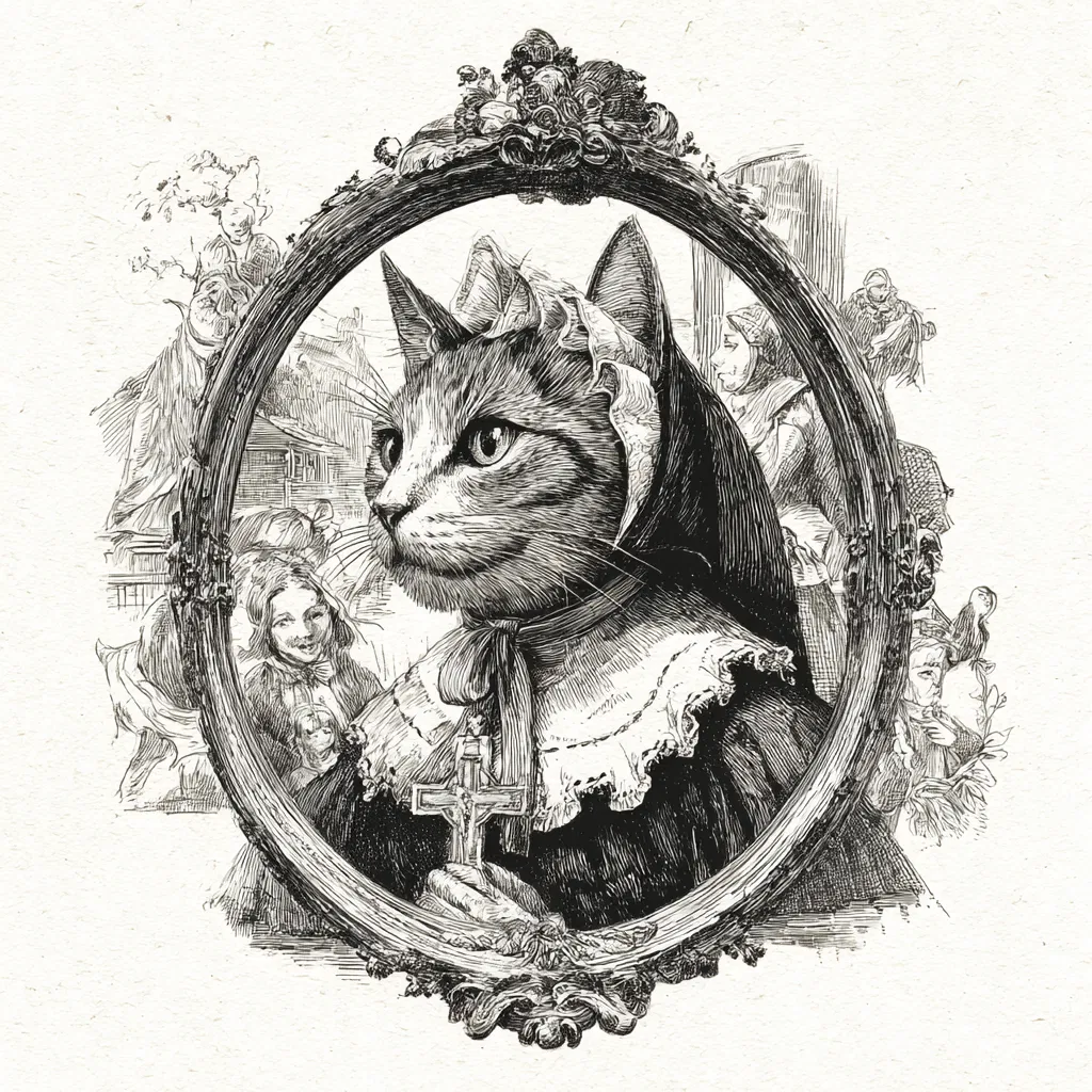 Transform your space with this charming illustration of a medieval-inspired feline. This unique sketch features an old nun cat, complete with a cross held delicately in her paw, capturing the whimsy and character of a bygone era. The vintage frame adds to the overall aesthetic, making it a delightful addition to your home decor.