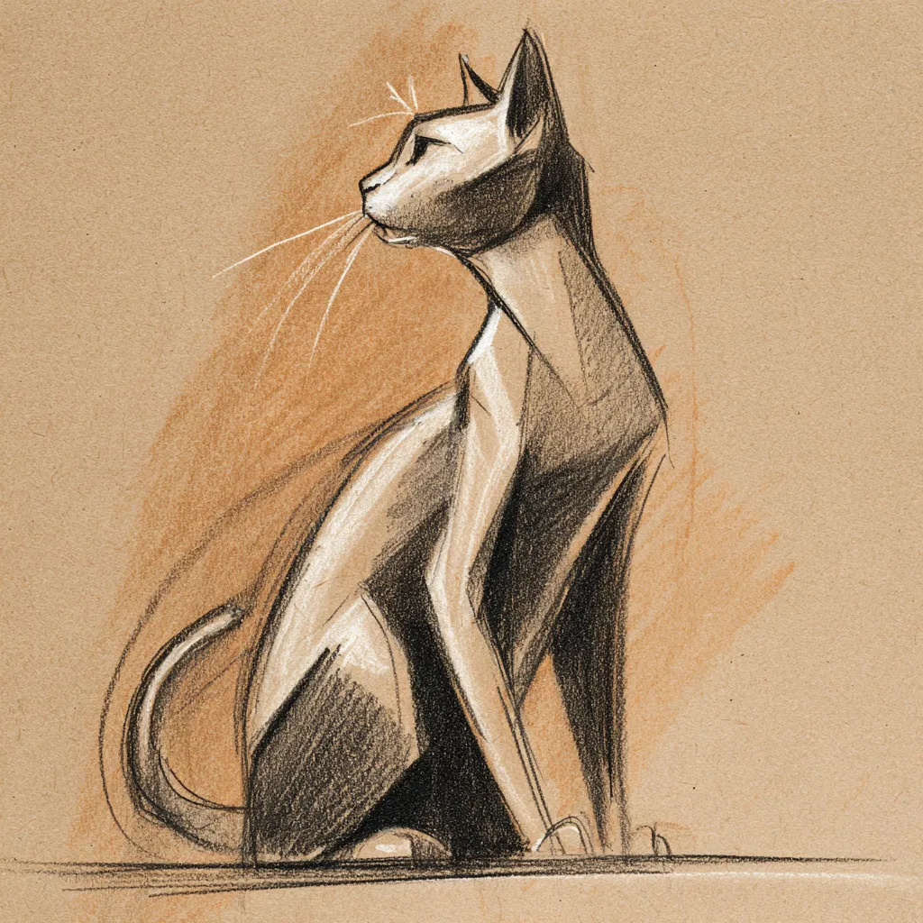 This captivating figure study features a mid-century modern atomic cat, beautifully rendered with conté crayon in warm sepia, black, and white tones. The artwork showcases a perfect blend of gesture and volume, capturing the playful essence of this charming feline. The use of classic atelier techniques adds depth and sophistication, making this piece a standout in any collection.