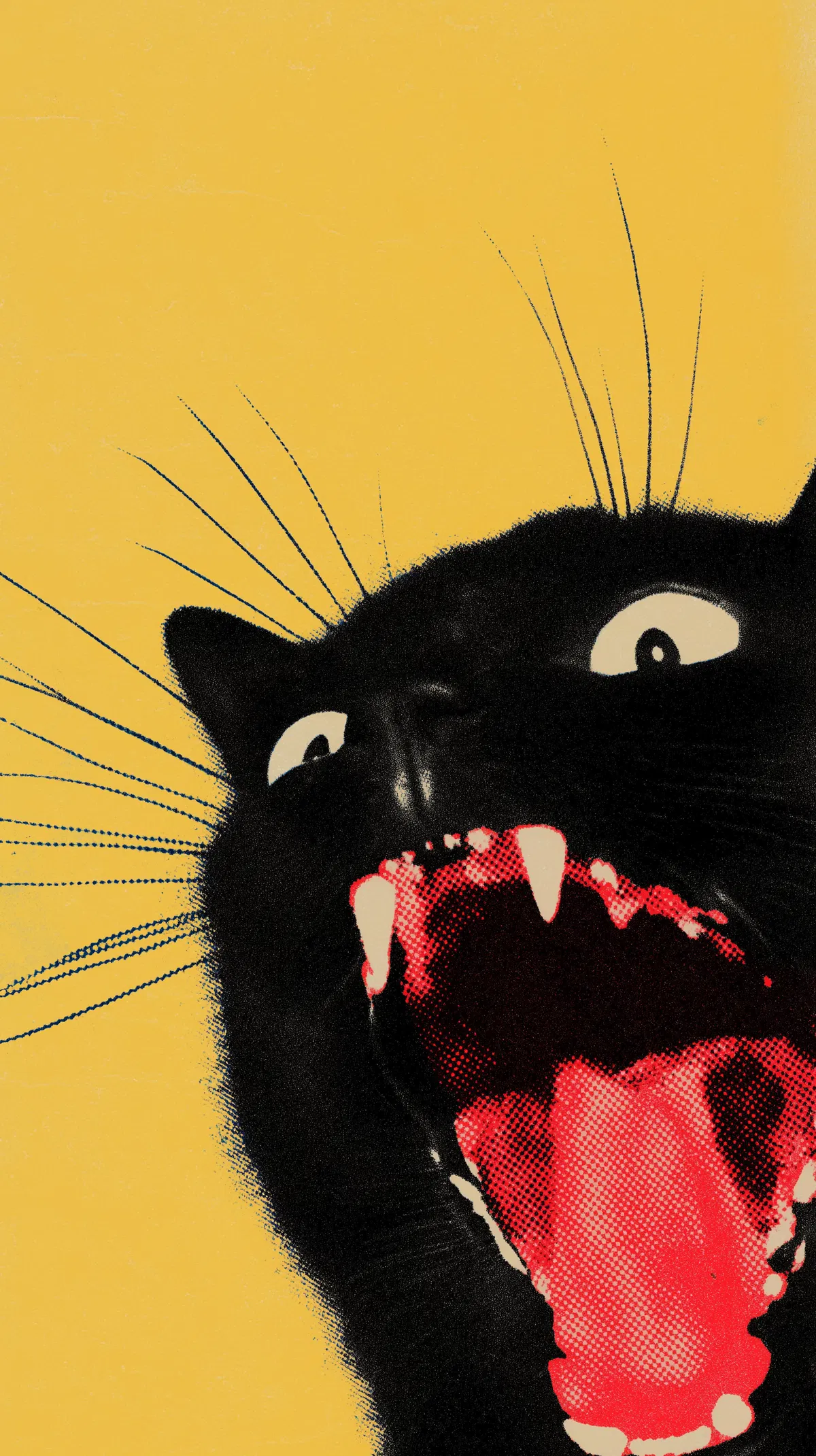 This vibrant retro screen-print poster captures the playful spirit of mid-century design with its striking illustration of a large black cat head. With its mouth wide open and a bright red tongue peeking out, this whimsical piece is sure to bring a smile to anyone’s face. The cartoonish eyes looking upward add a touch of curiosity, while the rough inked fur edges give it that authentic vintage charm.
