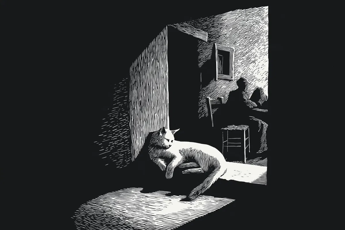 This minimalist engraving captures the serene beauty of a large cat lounging on a windowsill, bathed in the soft glow of a full moon. The simple black and white design reflects a style reminiscent of Matisse, emphasizing clean lines and expressive forms. The close-up portrait invites viewers to appreciate the cat’s tranquil demeanor and the peaceful atmosphere of a cozy country house.