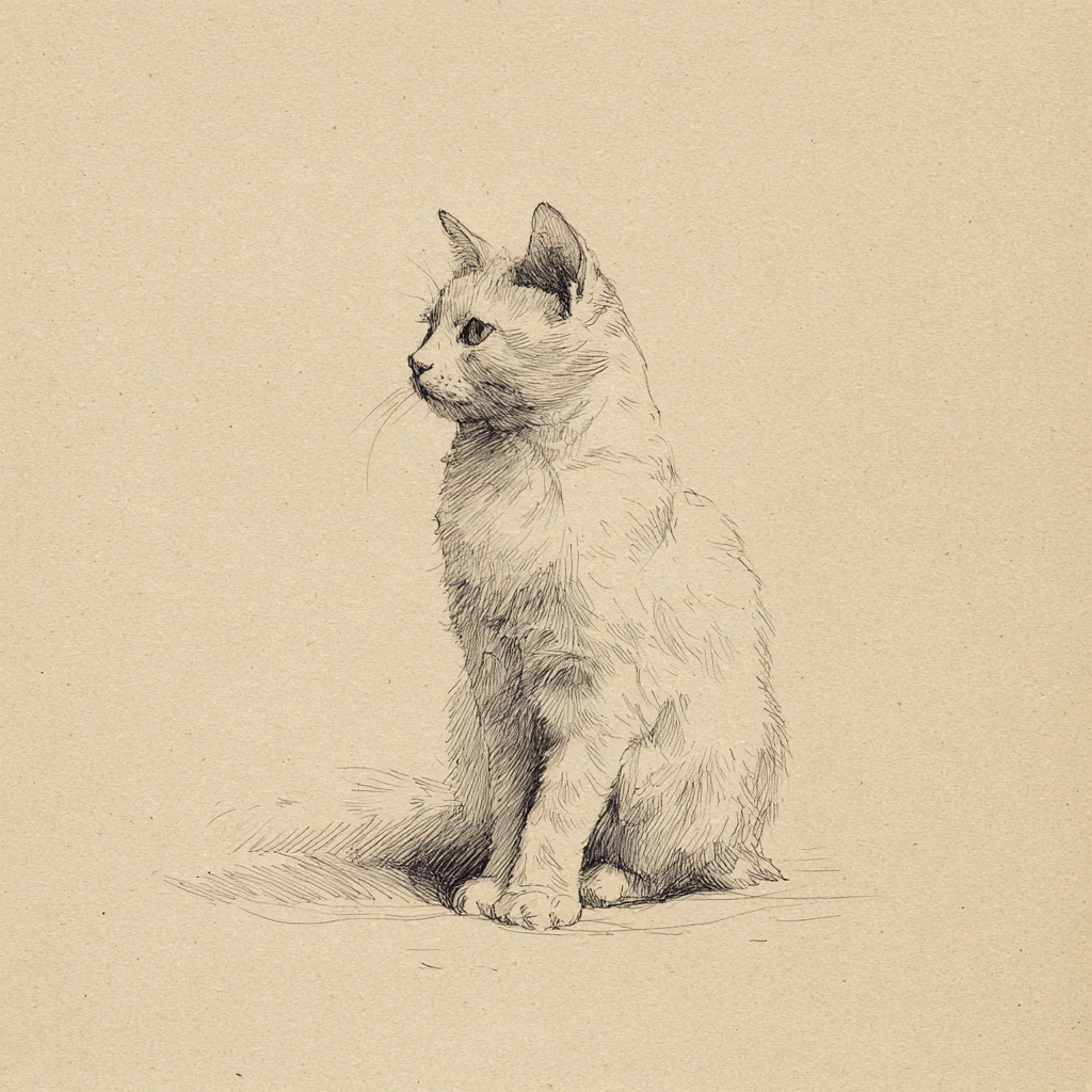This beautiful graphite pencil sketch captures the serene presence of a domestic cat, seated gracefully against a warm ivory-toned background. The delicate linework and subtle shading create a sense of calm, making this artwork a perfect addition to any cozy space. The understated contrast and fine details invite the viewer to appreciate the natural beauty of the feline form, while the generous negative space enhances the minimalist aesthetic.