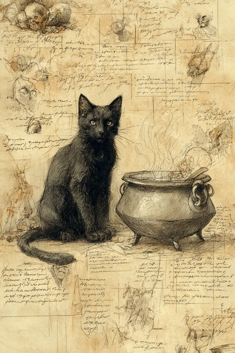 This enchanting illustration captures the essence of witchy decor with a beautifully detailed sketch of a black cat perched beside a bubbling cauldron. Set against an old parchment background filled with handwritten notes and whimsical scribbles, this artwork evokes a sense of mystery and magic. The muted tones give it a soft, atmospheric quality that enhances its mystical vibe, making it a perfect addition to any cozy space.