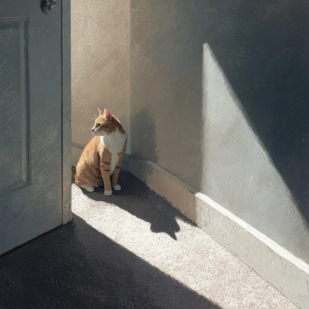 Imagine a charming scene where a photorealistic cat peeks around a corner, bathed in warm sunlight that filters through the window. The light creates soft shadows that highlight the cat’s delicate features, capturing its curious expression perfectly. This artwork draws inspiration from Edward Hopper’s iconic style, blending realism with a touch of nostalgia that evokes a sense of quiet contemplation.