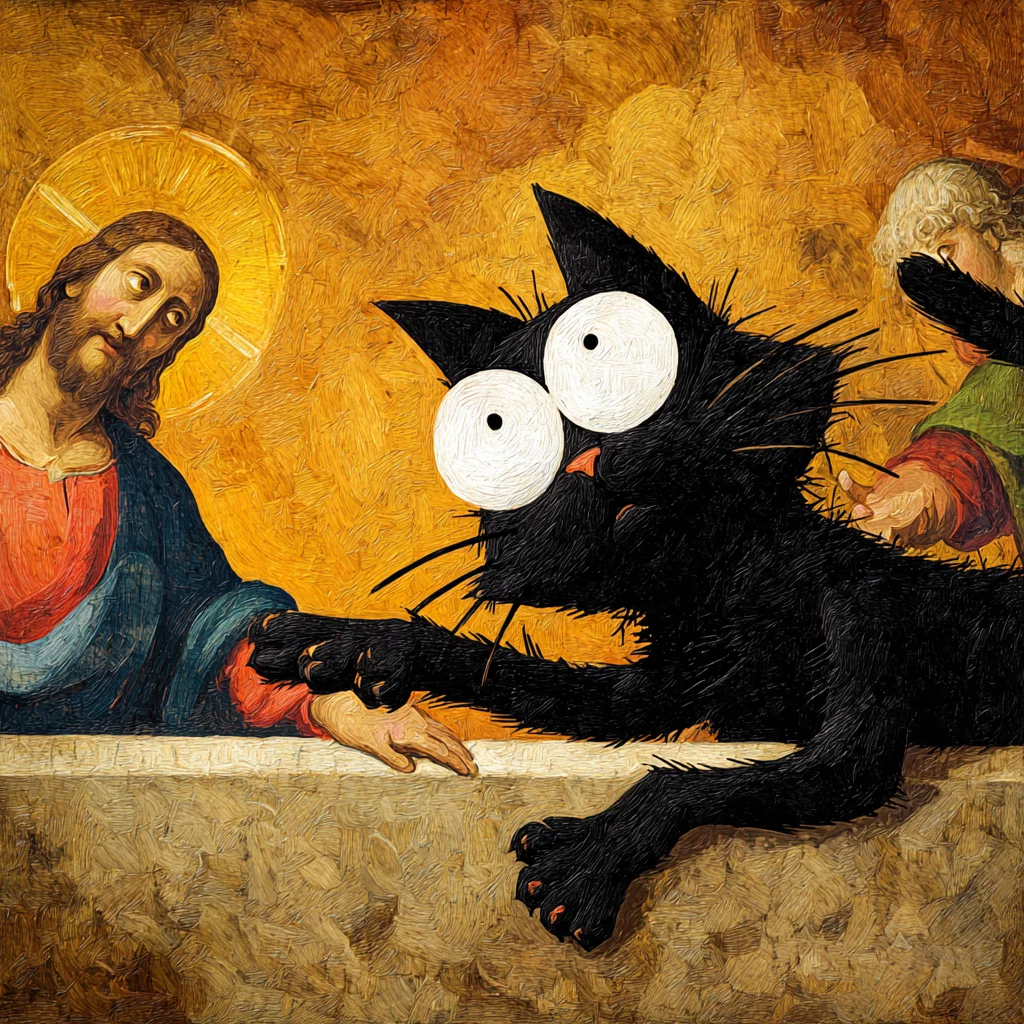 Imagine a delightful twist on a classic masterpiece, where a playful black cartoon cat takes center stage in a reimagining of Michelangelo’s iconic Creation of Adam. This charming feline, with its big, expressive eyes and fuzzy fur, reclines comfortably, one paw stretched out towards the hand of God. The scene maintains the grandeur of the original fresco, set against the stunning backdrop of the Sistine Chapel, yet it infuses a whimsical charm that only a cartoon cat can bring.