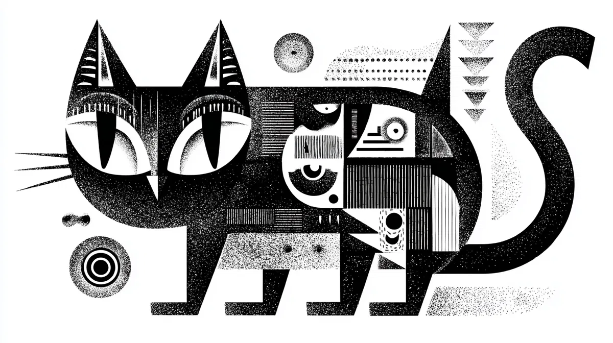 This playful cat design captures the whimsical spirit of Silent Era comedy, bringing a touch of nostalgia to modern aesthetics. With bold geometrical shapes and clean lines, this illustration stands out in striking black and white, making it a perfect addition to any t-shirt collection. The unique artistic style combines elements of mid-century brutalist architecture, resulting in a daring yet lighthearted look that appeals to cat lovers and design enthusiasts alike.