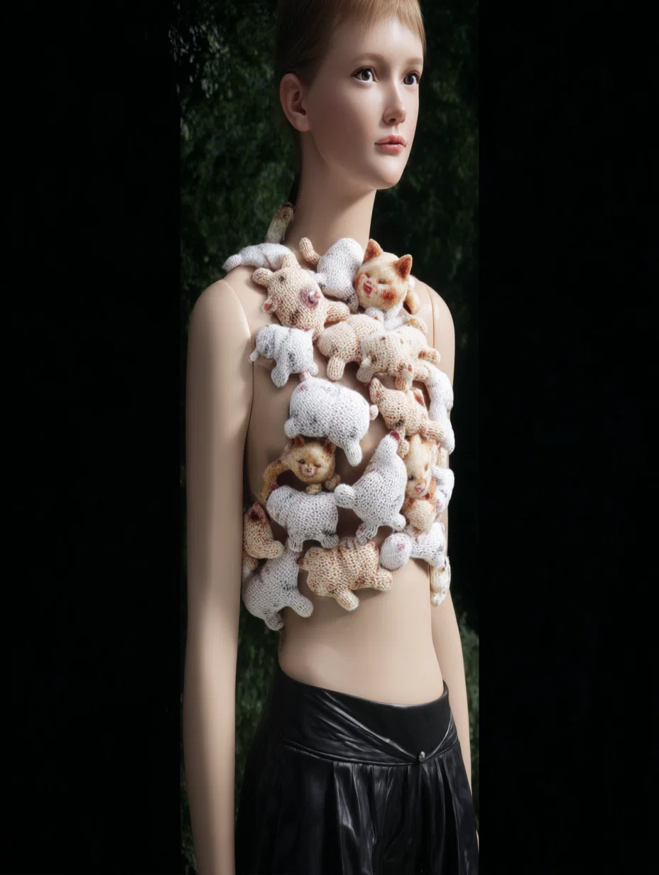 Imagine a whimsical world where fashion meets playful art with this delightful vest crafted entirely from plush, three-dimensional cartoon cats. Each chubby feline is a soft sculpture, engaging in adorable antics like snuggling, pawing, and climbing over one another. The unique design not only showcases their cute expressions but also forms a cozy, wearable piece that invites touch and interaction.