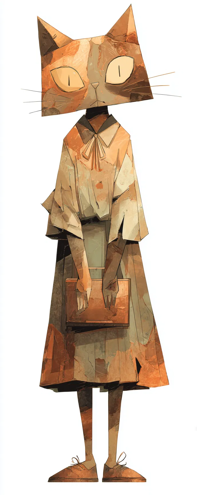 This captivating illustration features a humanoid calico tabby cat serving as a quirky secretary in a post-apocalyptic world. With its huge triangular head and a single rectangular torso-leg block, the character embodies a unique blend of absurdity and charm. The short, stubby legs and tiny thin arms add to the overall whimsical feel, making it a standout piece for any cat lover or art enthusiast.