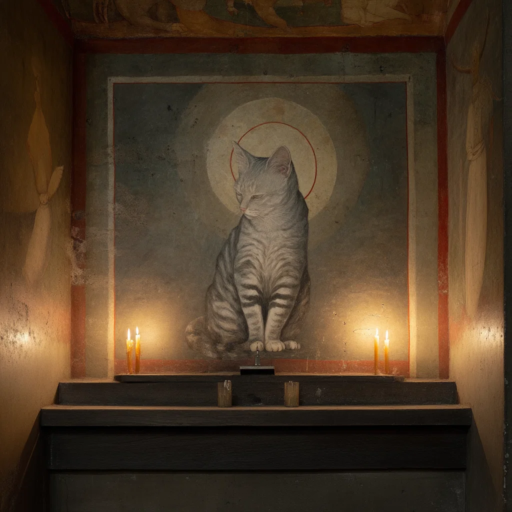 Discover the enchanting charm of this small shrine featuring a striking fresco of a regal striped gray cat. The detailed illustration captures the essence of feline grace, with the cat sitting majestically, surrounded by a soft halo and flanked by flickering candles. This artwork is not just a tribute to our beloved pets; it evokes a sense of reverence and warmth that can elevate any cozy space.