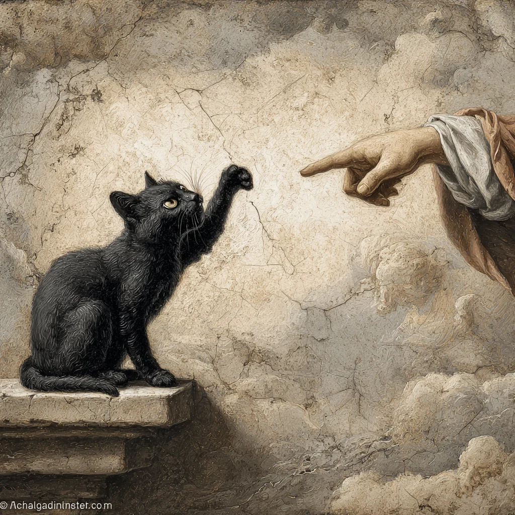 This playful fresco parody captures the essence of Renaissance art with a humorous twist. On the left, a striking black cat sits on a stone ledge, its expression a mix of annoyance and determination. With one paw raised high, it seems ready to swat at the human hand reaching towards it, creating a delightful contrast between feline frustration and classical elegance. The cat’s sleek fur and exaggerated features bring a whimsical charm to this piece, making it a standout illustration for any cat lover.