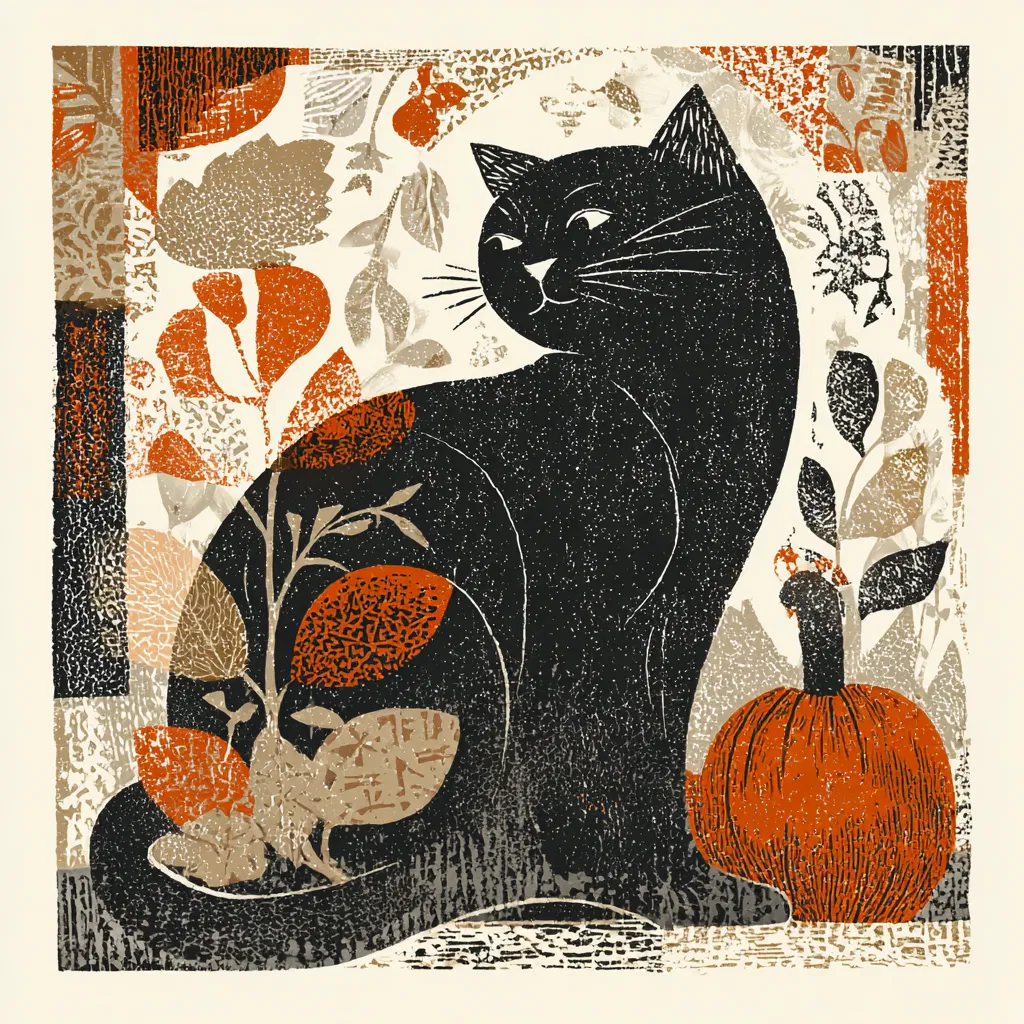 This charming illustration captures the essence of autumn with a delightful vintage woodcut style. At the center, a solid black cat sits gracefully among a vibrant array of fall foliage and a plump pumpkin. The blocky, textured lines give the cat a unique character, making it an eye-catching focal point in any cozy space. The muted earth tones of burnt orange, rust, and beige create a warm and inviting atmosphere, perfect for the season.