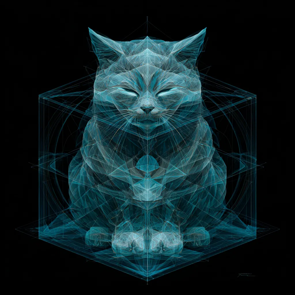 Discover the tranquil beauty of a tessercat, a serene feline representation of a tesseract that brings a touch of cosmic elegance to your space. With its calm expression and gentle focus, this artwork captures the essence of higher-dimensional geometry, inviting a sense of meditative peace into any room. The soft blues and teals create an ethereal atmosphere, making it a perfect piece for those who appreciate the intersection of art, mathematics, and nature.
