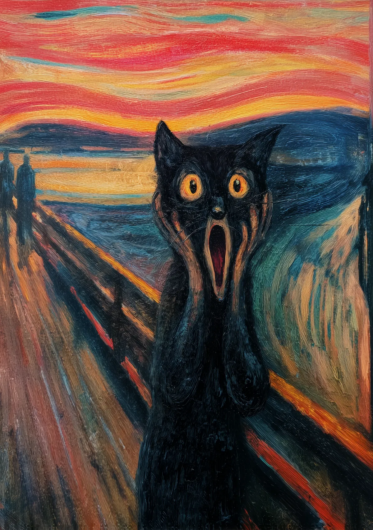 This surreal painting captures the essence of a terrified black cat, echoing the iconic pose of Edvard Munch’s The Scream. With wide eyes and an open mouth, the cat’s expression is both humorous and haunting, making it a striking focal point for any room. The dramatic brushstrokes and vivid painterly textures create a dynamic atmosphere, while the swirling colors of the sky and the distorted bridge add an otherworldly charm.