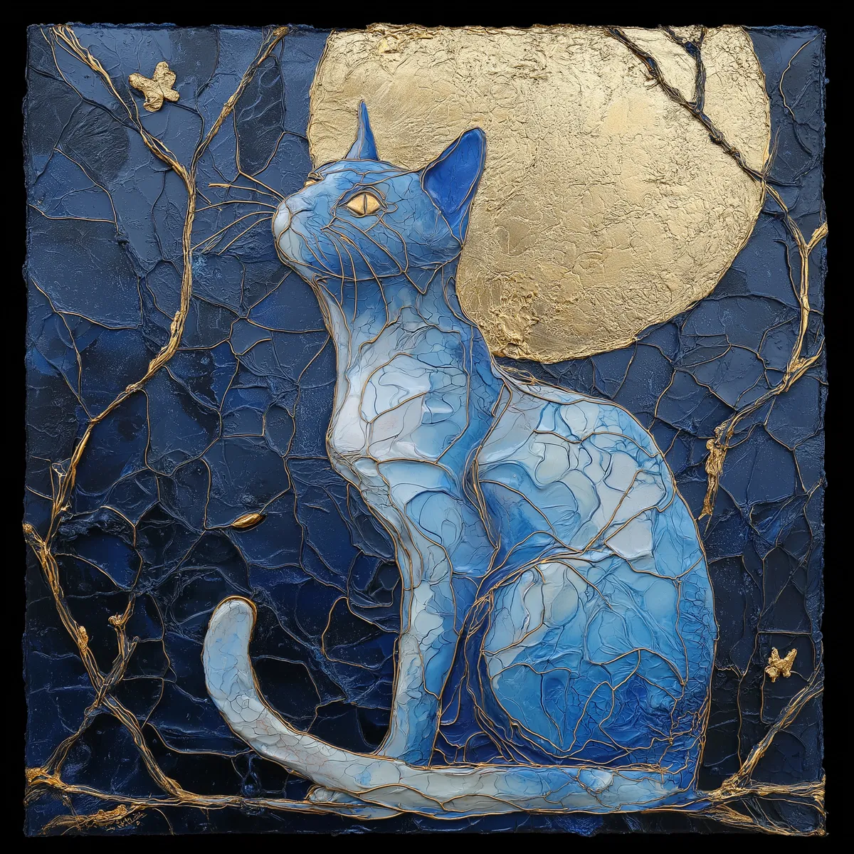 Transform your space with this stunning impasto oil painting that captures the essence of feline grace. The textured surface brings a unique depth to the artwork, while the rich blues and gold details evoke a sense of whimsy and serenity. Imagine a cozy corner in your home adorned with this enchanting piece, inviting warmth and creativity into your decor.