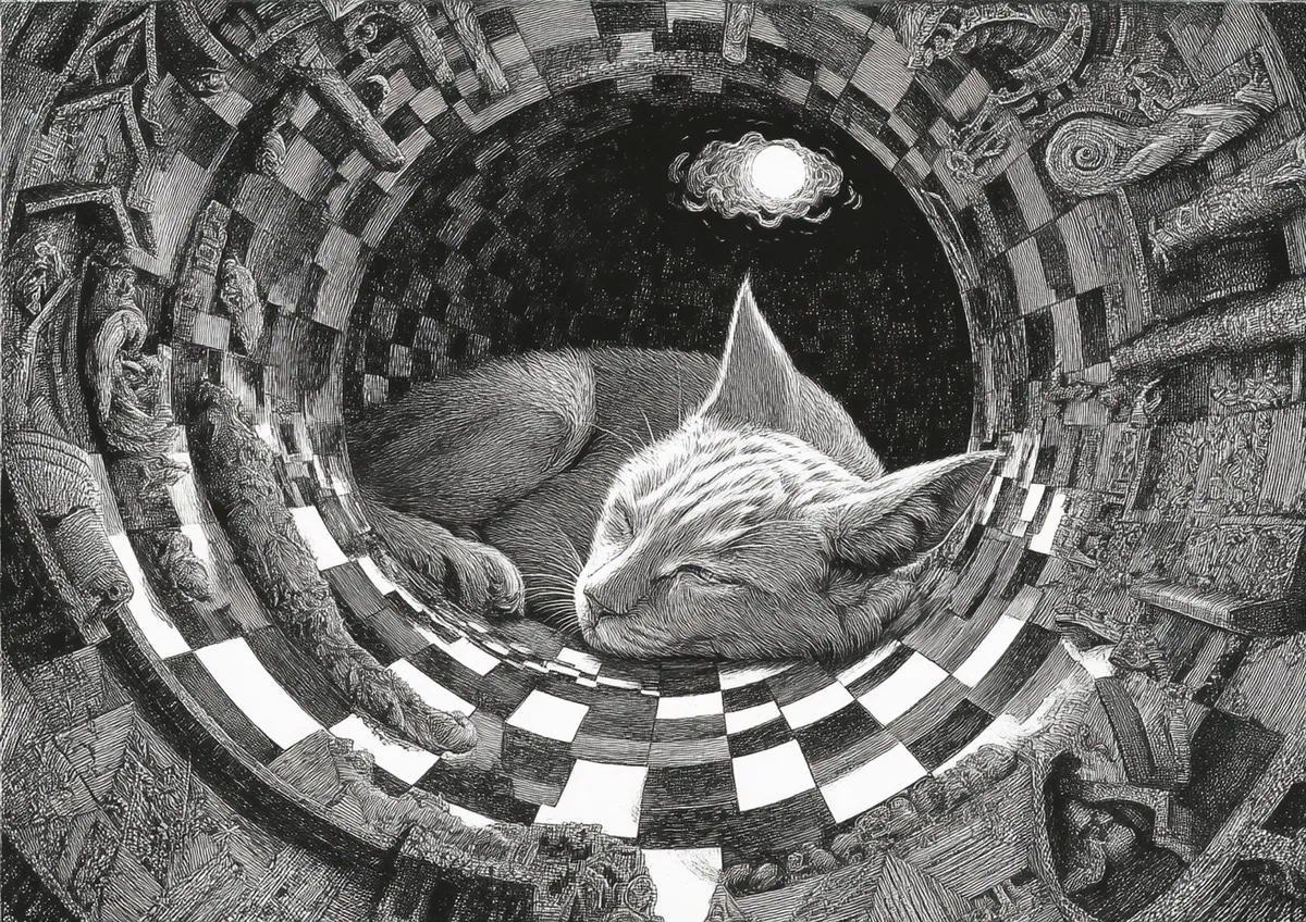 Step into a realm where chaos meets tranquility with this stunning piece of surreal fine art. Imagine a tiny oasis of bliss nestled within a swirling maelstrom, a captivating escape that invites you to pause and reflect. The intricate details of the illustration draw you in, showcasing a mesmerizing checkerboard pattern that morphs into whimsical animals, reminiscent of the imaginative styles of Escher, Dali, and Klimt.
