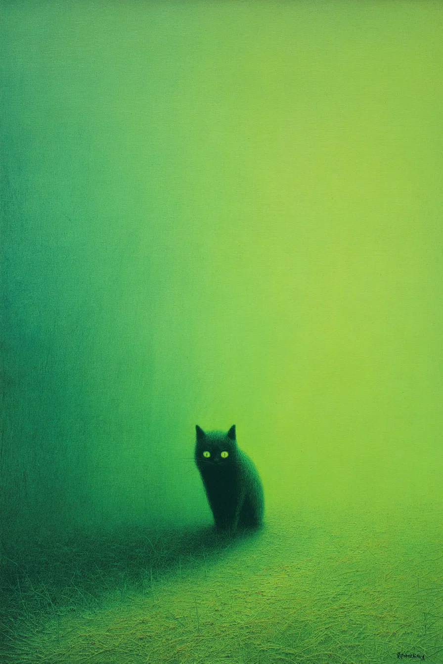 Dive into the whimsical world of surreal art with this captivating illustration of a green cat by Zdzislaw Beksinski. The striking use of color and unique design creates an intriguing focal point that will spark conversations and inspire creativity in any space. This piece perfectly balances the mysterious and the playful, making it an ideal addition for cat lovers and art enthusiasts alike.