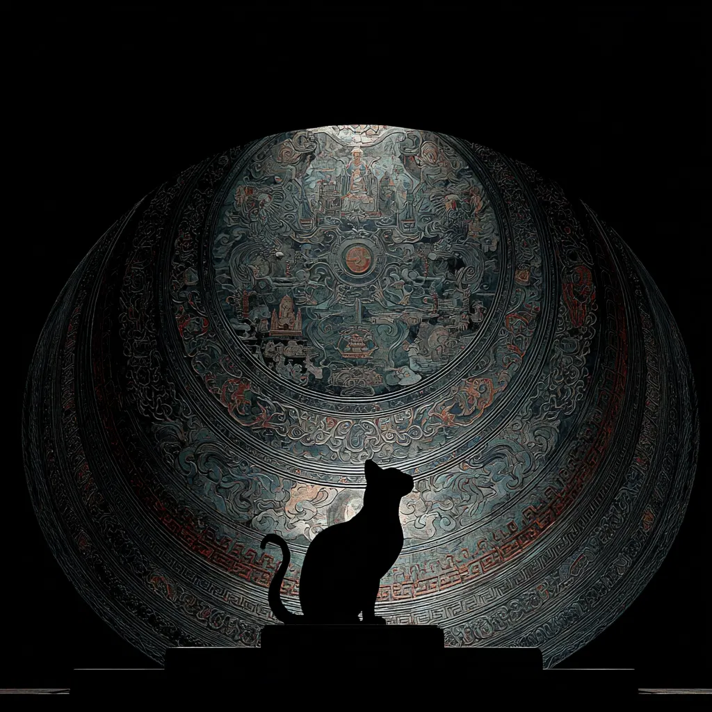 This stunning wall art features the silhouette of a large cat set against the intricate circular ceiling of the Dunhuang murals. The minimalist style and emotional expression create a captivating focal point that draws the eye, making it a perfect addition to any cat lover’s decor. The black background enhances the detailed design of the Tang Dynasty artwork, blending traditional Oriental aesthetics with a modern twist.