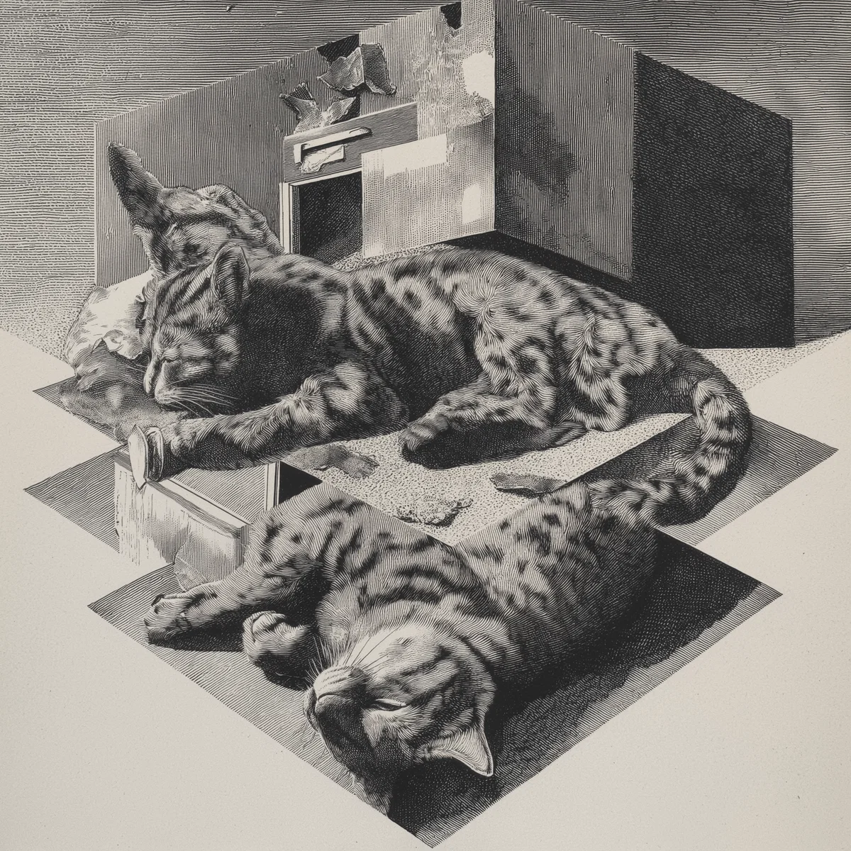 Dive into a world where the ordinary meets the extraordinary with this captivating surrealist illustration featuring a cat and a mailbox. The scene captures a whimsical street corner, folded and duplicated in a way that defies logic. The cat, in various poses, seems to melt into the very fabric of the corner, blurring the lines between animal and object. With its playful yet eerie charm, this artwork invites you to explore the boundaries of reality and imagination.