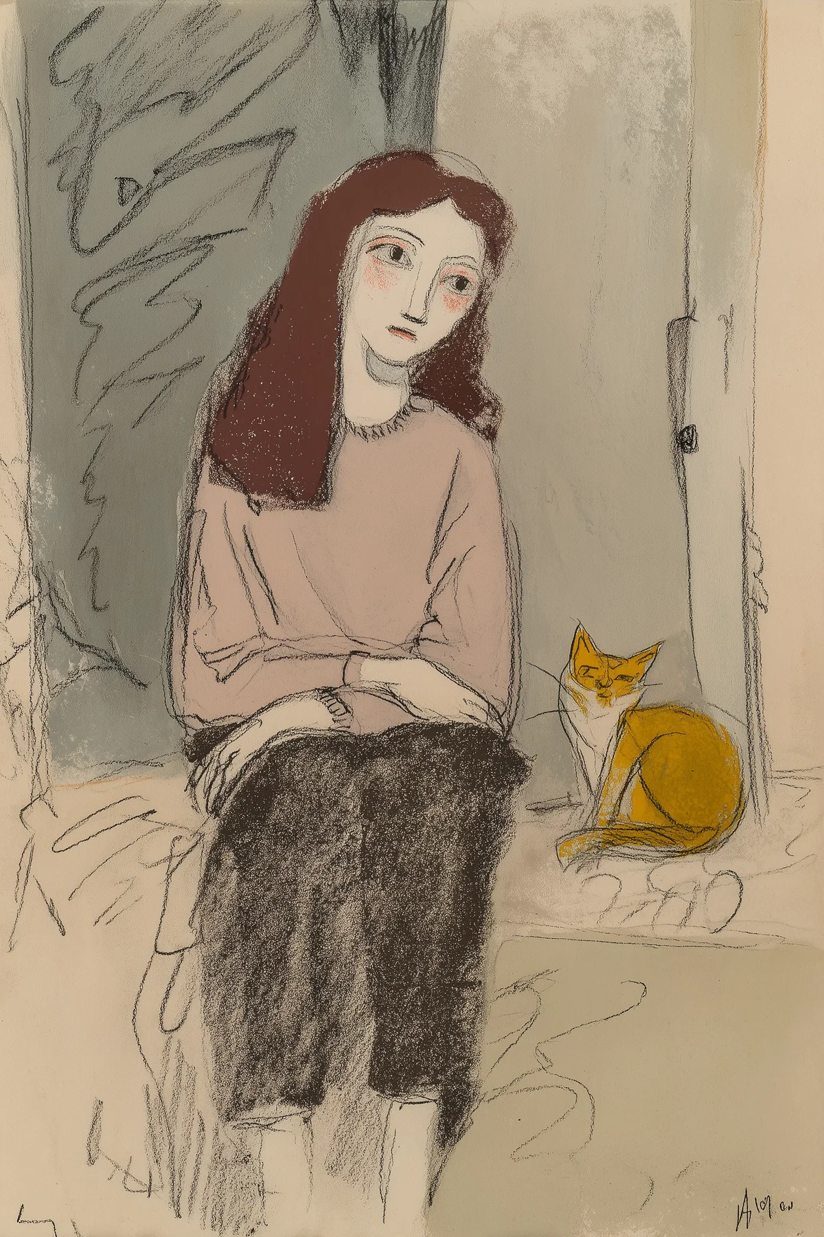 This captivating colored pencil illustration draws inspiration from the surrealist style of René Magritte, capturing a moment of introspection and emotional depth. A woman with long brown hair sits by a window, dressed comfortably in a sweatshirt and sweatpants, her orange cat nestled beside her. The scene is infused with a sense of calm and contemplation, evoking feelings of isolation and dreamlike logic.