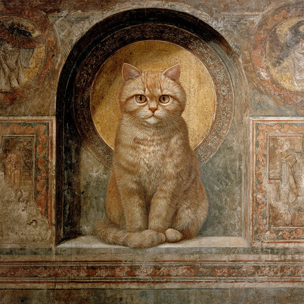 This stunning fresco mural captures the serene beauty of a ginger Scottish Fold cat, rendered in the iconic Proto-Renaissance style reminiscent of Cimabue and Duccio. The cat is depicted in a centered, frontal pose, seated gracefully on a small marble plinth within an elegantly pointed-arch niche. With its distinct folded ears and luminous round eyes, this artwork brings a sense of timeless charm to any space.