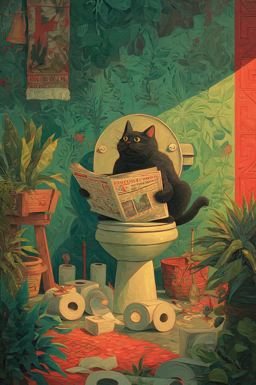 Imagine a charming scene where a black cat sits comfortably on an open toilet, engrossed in reading a newspaper. The vibrant green walls and lush plants create a lively backdrop, while playful toilet paper rolls scattered on the floor add a touch of whimsy. This delightful illustration captures the essence of fantasy realism with bold colors and strong lines, making it a standout piece for any cat lover.