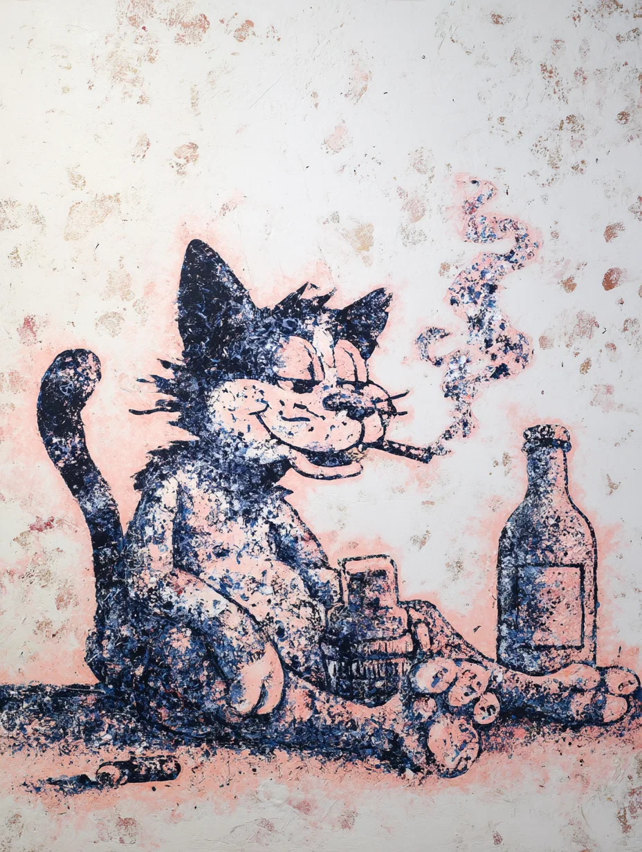 This playful acrylic on canvas artwork features a charming anthropomorphic cat lounging comfortably next to a bottle of milk. The thick, simple lines and vibrant paint-splattered style create a whimsical vibe that instantly brightens any space. This unique illustration captures a relaxed moment, making it a perfect conversation starter for cat lovers and art enthusiasts alike.