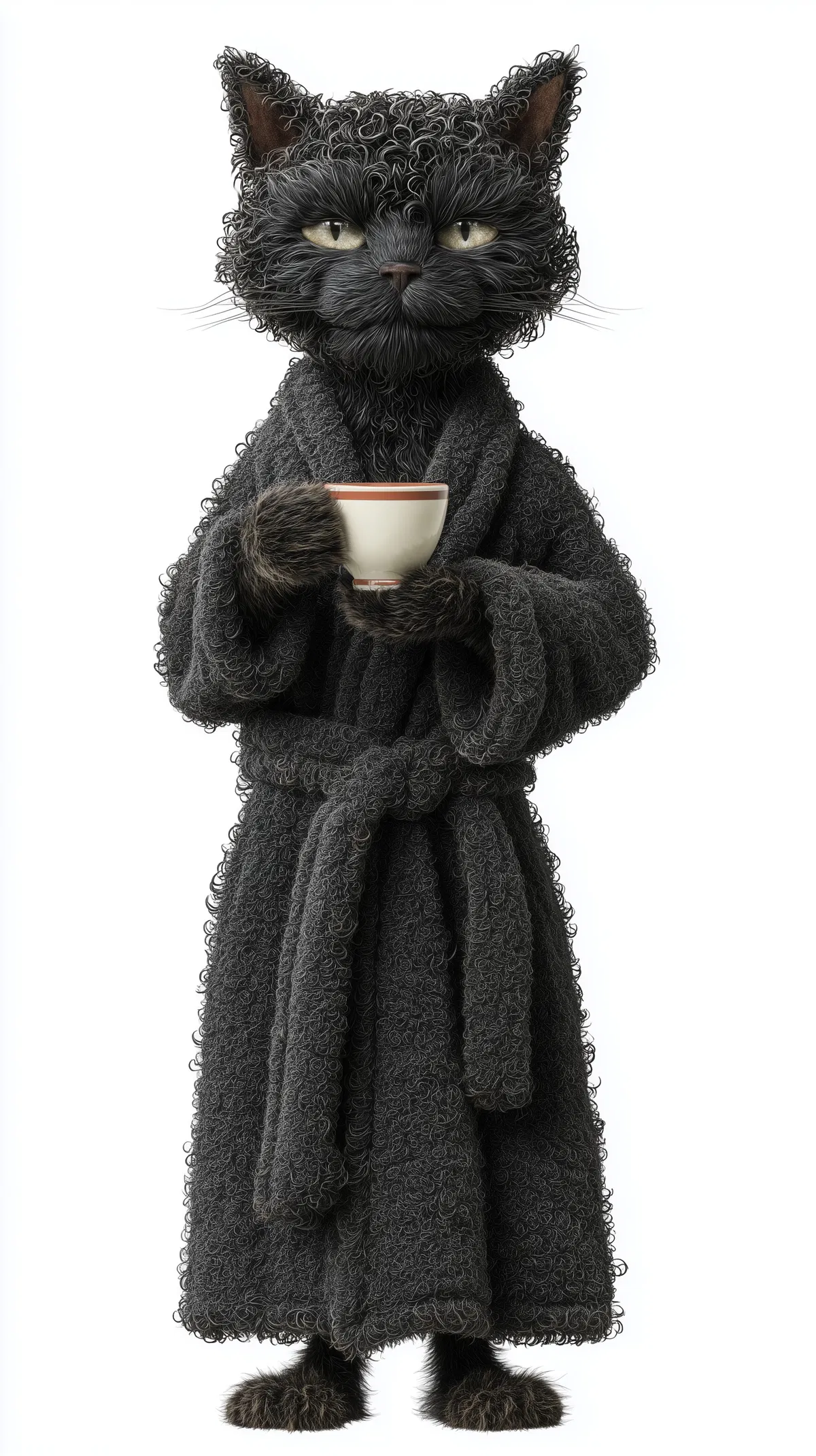 Imagine a whimsical scene featuring a photo-realistic black cat with a charming human-like body and an adorable cat face. This unique character boasts curly fur and is cozily wrapped in a cute robe, holding a steaming cup of coffee. The ultra-detailed image captures the essence of comfort and playfulness, making it a perfect addition to any cat lover’s collection.