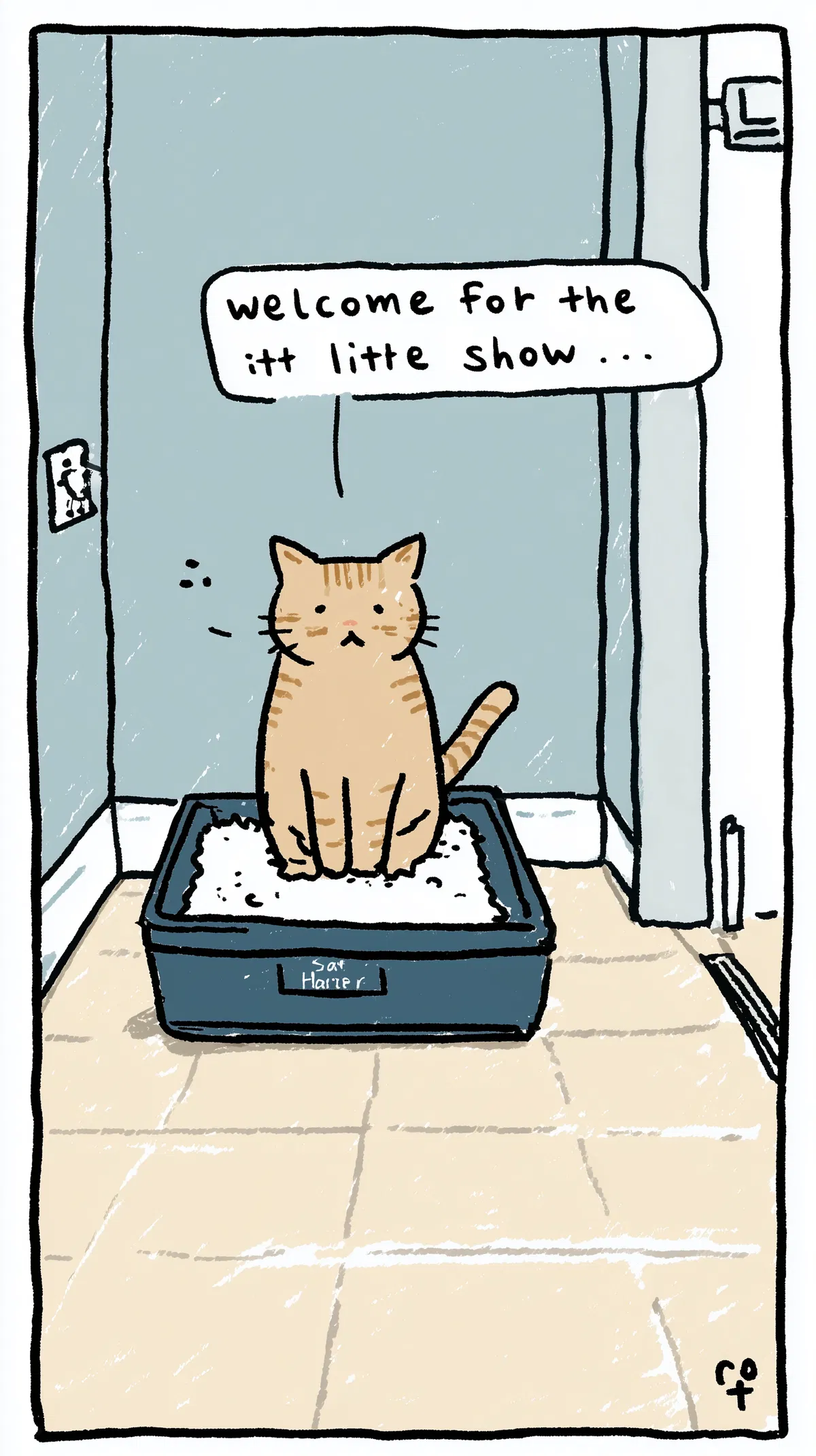 This playful 2D illustration captures the charm of cat ownership with a whimsical twist. Featuring a cute cat perched on its litter box, the design is both humorous and relatable, perfectly embodying the ups and downs of pet parenting. The cheeky phrase “welcome to the shit show” adds a lighthearted touch, making it a delightful conversation starter for any cat lover.