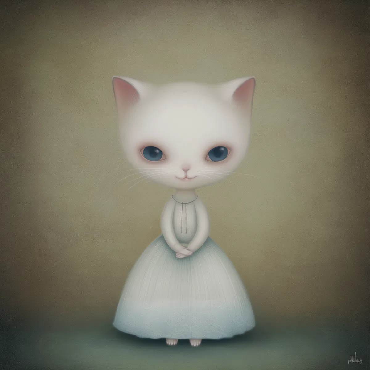 This charming illustration features a whimsical white cat, beautifully rendered in the enchanting style of Nicoletta Ceccoli. With its playful expression and soft, dreamy colors, this artwork captures the essence of feline grace and curiosity. The delicate details and imaginative elements make it a perfect addition to any cat lover’s collection.